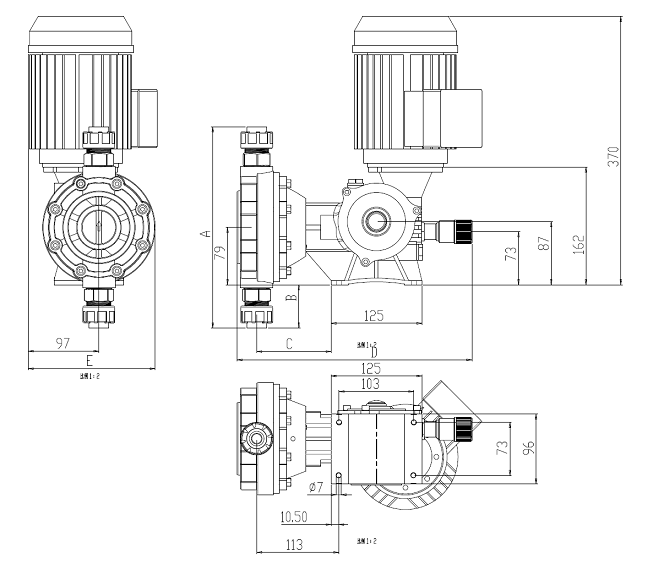當推桿拉動膜片往后運動時,膜片與泵頭之間容積增加,產生負壓,吸入管路的單向閥打開,進口管路中的介質進入泵頭腔體內,當吸入沖程結束,隔膜運動瞬間停止,泵頭內壓力與進口管內壓力平衡,吸入口單向閥復位。在排出沖程時,與滑桿連接的膜片向前運動,泵頭內壓力立刻升高,當泵頭壓力高于出口壓力時打開出口單向閥,泵頭內的介質進入排出管路,當排出沖程結束時,膜片運動再次停止,泵頭內的壓力與出口壓力相等,出口單向閥復位,然后進入下一個循環,從而形成液體以脈沖形式的傳輸。轉動沖程調節桿,調節桿向箱體內旋轉進給或遠離,使得推桿行進的距離相應的減小或增大,從而調節沖程的大小,最終達到改變沖程調節流量的目的。